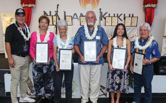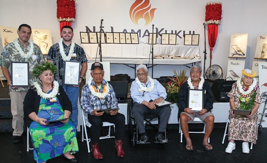 Auhea ʻoukou e nā manu, nā alo leo o ka ʻāina. Lele mai! Lele mai! E nā manu lele mai i ka Lā Kūkahekahe! On February 14, as part of the month-long celebration of Mahina ʻŌlelo Hawaiʻi (Hawaiian Language Month), the Office of Hawaiian Affairs (OHA) hosted the first Lā Kūkahekahe in nearly a decade. First established in the 1970s by ʻAhahui ʻŌlelo Hawaiʻi, Lā Kūkahekahe was a day dedicated to celebrating ka leo o ke ola (the voice of life) through meaningful conversation, friendly competitions, live music, games, and food. OHA presented Lā Kūkahekahe in partnership with ʻAhahui ʻŌlelo Hawaiʻi, ʻAha Pūnana Leo, Hawaiian Council, Ka Haka ʻUla o Keʻelikōlani, Kamehameha Schools Kapālama, Kanaeokana, Kāhuli Leo Leʻa, Kui Leo Hawaiʻi, and Kuini Piʻolani Hawaiian Civic Club. It was one of a series of gatherings last month that support the strengthening of Hawaiian language efforts and relationships across the pae ʻāina. Notably, this Lā Kūkahekahe honored our mānaleo (native speakers) and the original members of ʻAhahui ʻŌlelo Hawaiʻi for their contributions to the perpetuation of our language. In the top photo, representatives of the original steering committee that met in May 1972 and eventually established the ʻAhahui ʻŌlelo Hawaiʻi are honored. (L-R): OHA Trustee Dan Ahuna, Marvi Rosehill Ching (representing her mother, Violet Māhela Rosehill), Sarah ʻIlialoha Keahi, ʻAimoku McClellan (representing his mother, Esther Waiheʻe McClellan), Kamaluapāwehi Abad (representing her grandfather, Fred Cachola), and Dr. Larry Kimura. Also remembered at Lā Kūkahekahe were late steering committee members Dorothy Kahananui and Carinthia Harbottle. In the bottom picture, our remaining manaleo (native speakers) are honored. Sitting (l-r) are Louella ʻŌpuʻulani Albino, Karin Haleamau, Kahu David Kaupu, Kahu Charles Milikaa Yabui, and Carnation SaiFarr Harvest. Standing behind the manaleo are (l-r) Keala Kaupu, representing his aunt, Mable Paupalai Kaupu Boyd, and Kanoah Stevens representing his grandmother, Irene Nohokaha Midel. – Photos: Nelson Gaspar